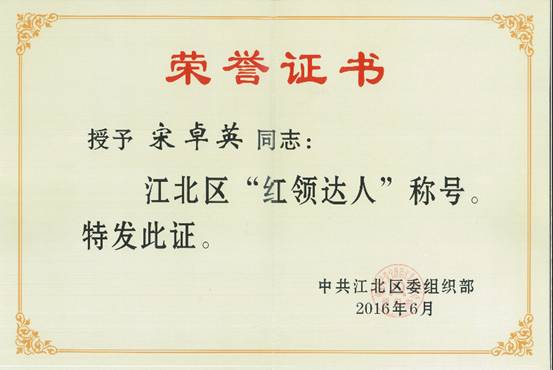 宋卓英同志(zhì)榮獲江北(běi)區(qū)“紅(hóng)領達人(rén)”稱号